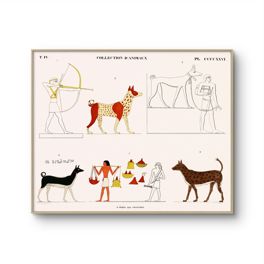 Lámina que muestra perros, cazadores y escenas de carga tomadas de distintas tumbas. La variedad de estilos y acabados resalta el enfoque documental de la expedición egiptológica.