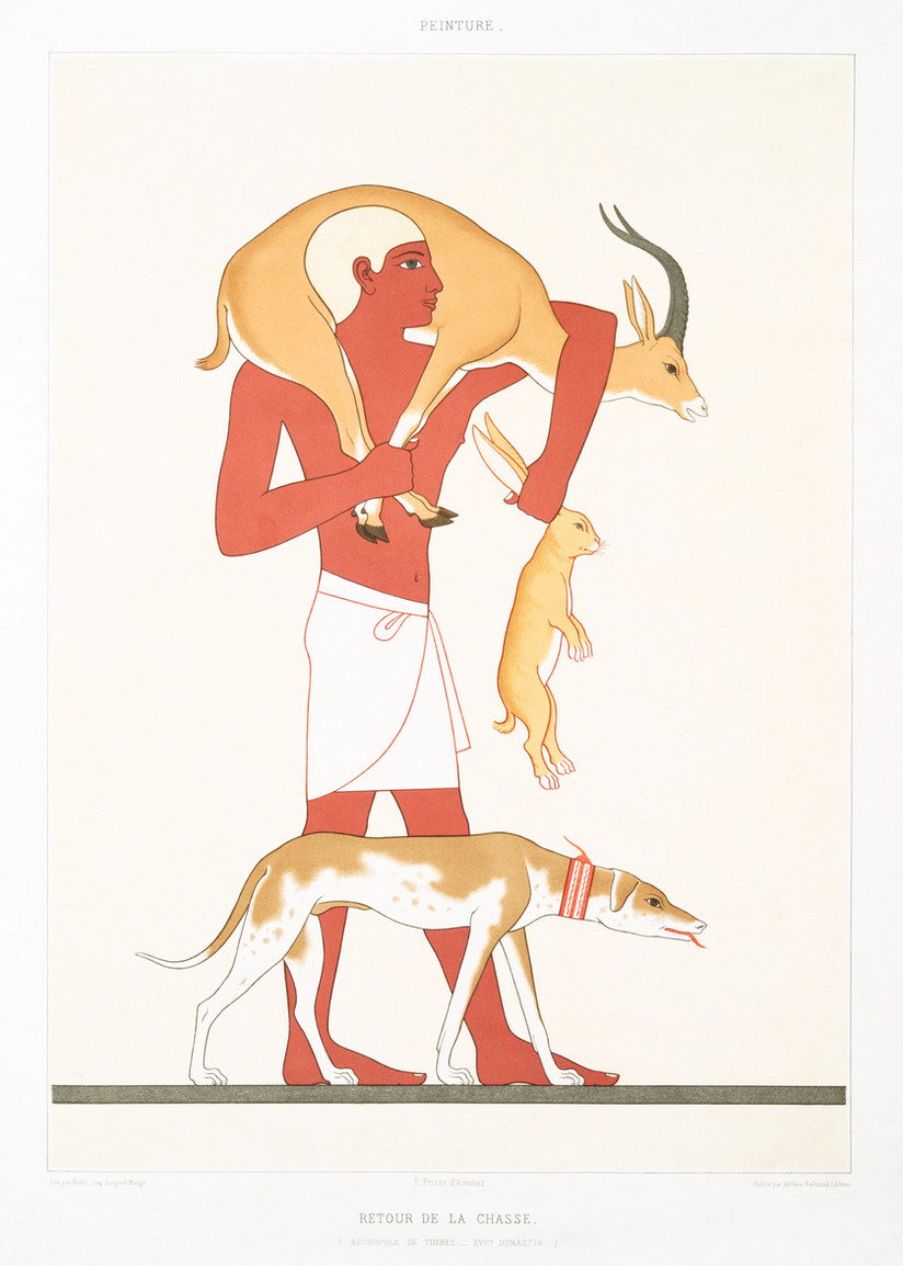 Un cazador egipcio camina acompañado de su perro mientras transporta antílopes y liebres. Esta escena refleja la relación entre el hombre y la naturaleza, y fue tomada de pinturas murales que retratan la vida cotidiana con notable elegancia formal.