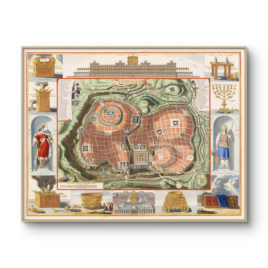 En 1652, el cartógrafo holandés Joan Blaeu publicó un mapa detallado del Templo de Jerusalén, conocido como el Templo de Salomón. Este mapa, que forma parte de su obra Novus Atlas, ofrece una representación precisa del templo y sus alrededores, reflejando el avanzado conocimiento cartográfico de la época.